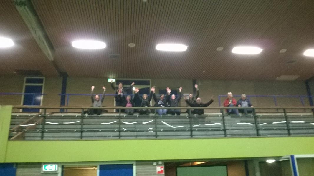 2014-03-23 Laatste wedstrijd dames 2 - publiek… kwam de scheidsrechter niet opdagen en dus is onze wedstrijd afgelast. Niet de manier waarop we afscheid wilden nemen van Lisette. Zij heeft besloten een punt te zetten achter haar handbalcarrière en ‘speelde’ vandaag haar laatste wedstrijd. Lisette, we gaan je missen!