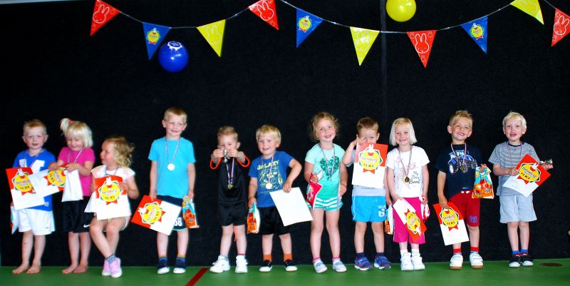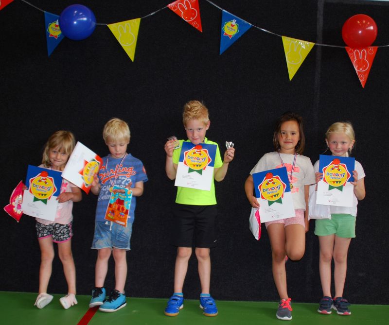 In de Nieuwe Coers stond een groot circuit aan onderdelen uitgestald waar begin van de middag de jongste kinderen, onder begeleiding van leidster Inge Wouters, hebben laten zien wat zij het afgelopen seizoen geleerd hadden. Zo rolden zij van de mat, gooiden met de bal, sprongen op de trampoline en schommelden aan het rek waarna zij onder luid applaus van het publiek hun nijntje Beweegdiploma 1 in ontvangst mochten nemen. Ze straalden bij de uitreiking van dit diploma en de medaille die ze omkregen.