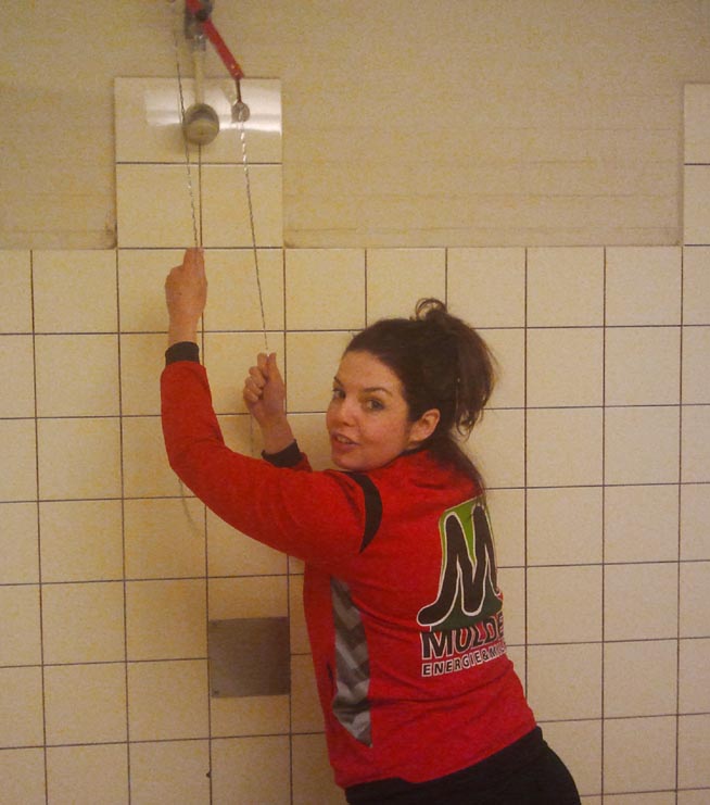 2014-03-09 VZV-Wesepe - doucheHet was een flinke reis, maar de sfeer zat er goed in. Wellicht had dat te maken met het feit dat we hier niks te verliezen hadden en we dus zonder druk konden spelen (of was het toch de fles rosé?). De verslaggever van VZV was vorige keer niet erg enthousiast over onze Hooiberg, dus we verwachtten in een prachtig complex aan te komen. Groot was dan ook de teleurstelling toen we ontdekten dat we de douche zelf nog moesten aanslingeren (zie foto).