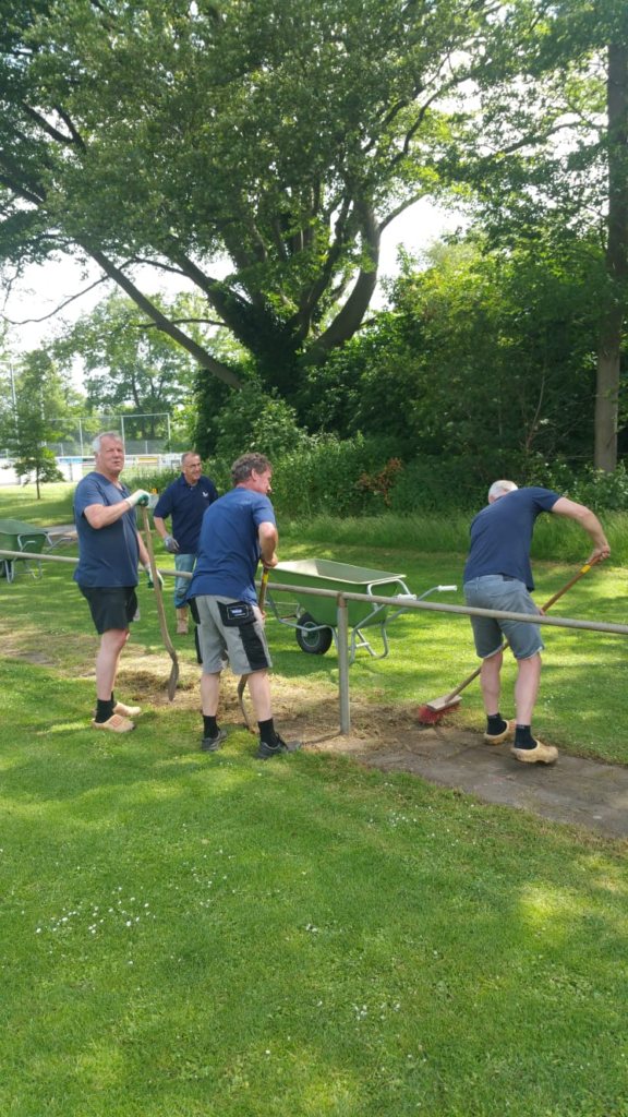 Woensdagavond 16 juni en zaterdag 19 juni werd er ondanks de warmte flink geklust op sportpark de Muggert. Sinds lange tijd lieten de coronamaatregelen het weer toe en konden een groot aantal leden (man en vrouw) de handen uit de mouwen steken om weer groot onderhoud te verzetten. Allerlei klusjes werden aangepakt. Van snoeiwerk, kantjes steken en gras tussen de tegels verwijderen tot aan ramen wassen en doelpalen boenen. Nadien lag het sportpark er weer prachtig bij. Zo’n 2 a 3 keer per jaar worden dit soort werkzaamheden ingepland. Naast de wekelijkse bezigheden door de donderdagmorgen groep en vaste schoonmakers worden dan wat grotere klussen gedaan. Dit alles onder leiding van de accommodatiecommissie. Naast dat er hard gewerkt wordt, is het ook een gezellig gebeuren, waarbij goed voor de catering gezorgd wordt.Mocht je het nou ook leuk vinden om een keer te helpen, laat het dan gerust weten. Ook ouders van jeugdleden zijn van harte welkom. Je leert op deze manier de club goed kennen en kunt op deze manier jouw steentje bijdragen. Op dit moment is de accommodatiecommissie nog op zoek naar een aantal schilders, die wat uurtjes daaraan willen besteden.