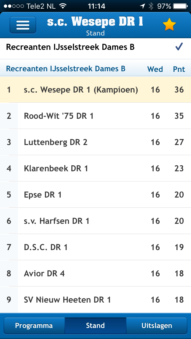 Luttenberg de eerste set te pakken. Met heel wat kabaal vanaf de tribune was dan ook gelijk duidelijk dat de dames van Wesepe kampioen waren geworden in de poule. Maar uiteraard moesten voor deze wedstrijd de twee volgende sets nog gespeeld worden. Beide zeer spannende sets zijn door Rood-Wit gewonnen. Eindresultaat: een heel mooie tweede plaats voor de Wijhese ploeg!