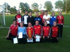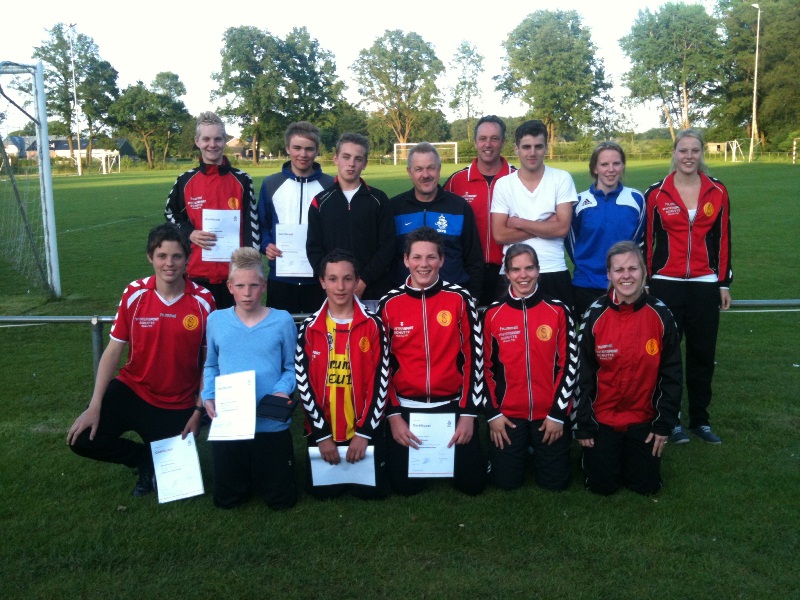 Woensdag spande het er dan echt om; de praktijk! Dit bestond uit het fluiten van een wedstrijdje, iedereen was ongeveer 6 minuten aan de beurt. Speciaal voor deze gelegenheid speelden onze eigen F1 tegen onze eigen F2. En er werd een wedstrijdje gespeeld van een mix E1/E3 van onze eigen club. Leiders/trainers/spelers, bedankt voor jullie medewerking! Na dit prakijktgedeelte, waar iedereen glansrijk voor geslaagd was, kregen we nog een meerkeuze toets van 15 vragen. Het spande er even om, maar iedereen was toch echt geslaagd. Trots nam iedereen zijn/haar certificaat in ontvangst en we kregen als cadeau vanuit de KNVB nog een mooi tasje waarin een fluit, een notitieblokje, een pen en de badge van pupillenscheidsrechter zat. Tot slot nog even met z’n allen op de foto, samen met de docent van de KNVB, Hans Noortman. Hans, bedankt voor deze 2 avonden! Scheidsrechters; gefeliciteerd en we hopen dat jullie veel plezier beleven aankomend seizoen bij het fluiten van wedstrijden! Succes!