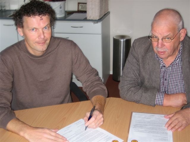 Op de foto ondertekent Ronny Obdeijn het contract onder toeziend oog van Herman Schoneveld. Kijk verder voor een teamfoto van de B1 in de nieuwe shirts.