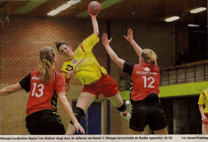“Ik heb tot mijn twintigste bij Wesepe gespeeld,” vertelde de 29-jarige handbalster na afloop. “Maar ik ben het daarna hogerop gaan zoeken in Groningen, Emmen en Hengelo.” Ze is blij dat ze terug is, helemaal na de monsterzege op Kwiek 3: “Het niveau is lager, maar dit is een leuke, fanatieke groep meiden.”