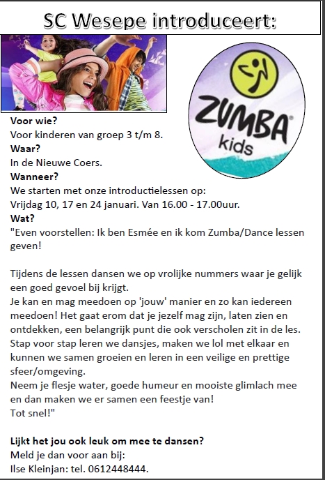 Voor kinderen van groep 3 t/m 8 komt er iets nieuws in Wesepe: ZUMBA!